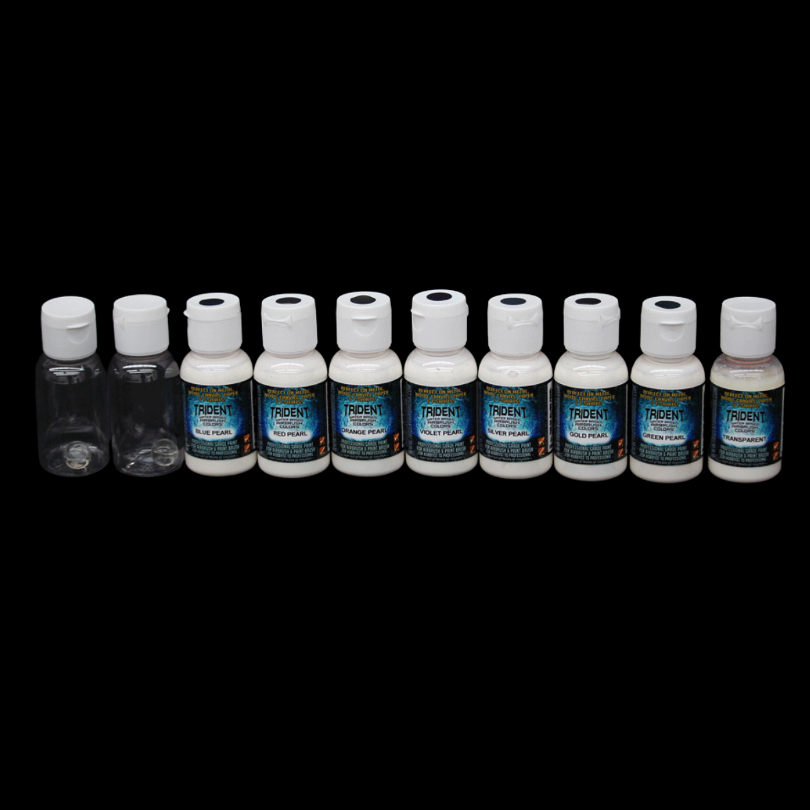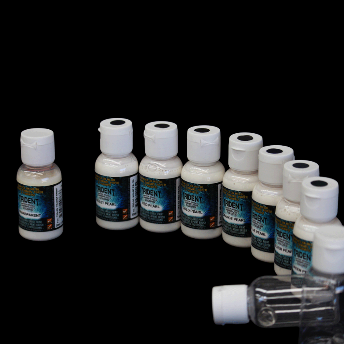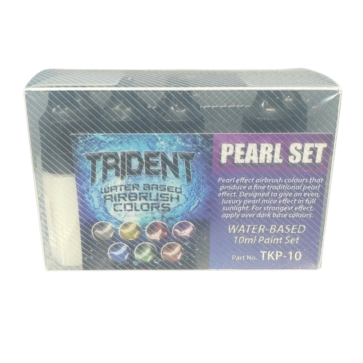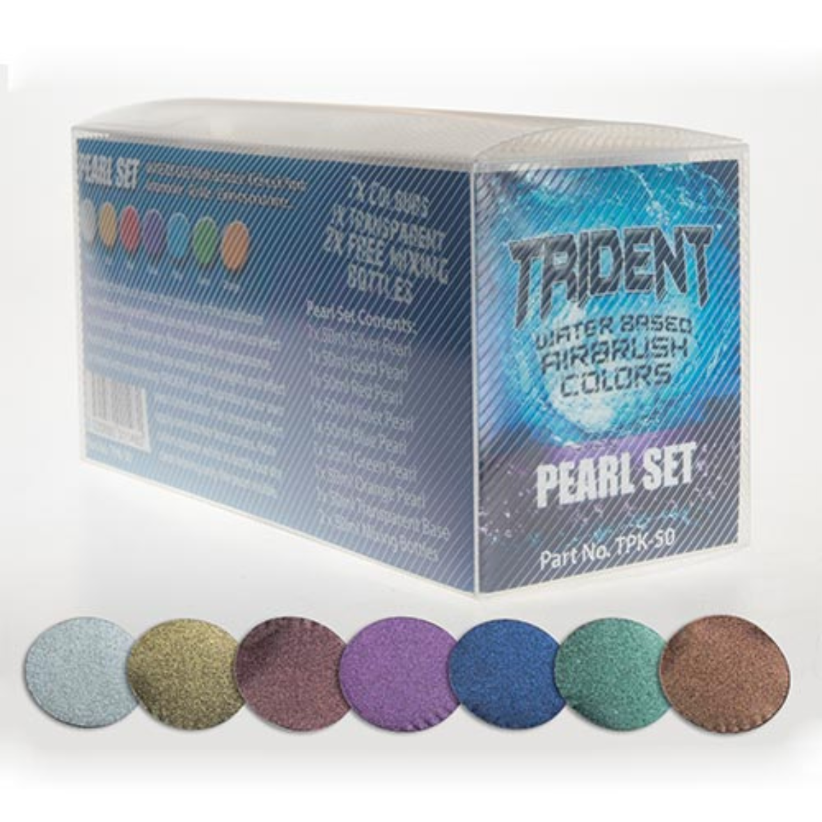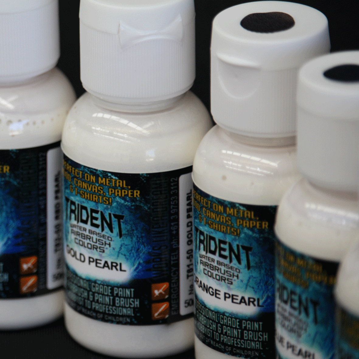 Pearl effect airbrush colours that produce a fine traditional pearl effect. Designed to give an even, luxury pearl mica effect in full sunlight. They are very fine and subtle in appearance. Pearls can be used over the top of artwork for highlights and effect or mixed into an existing Trident colour to produce your very own pearl tinted colour. For strongest effect apply over a darker base colours.